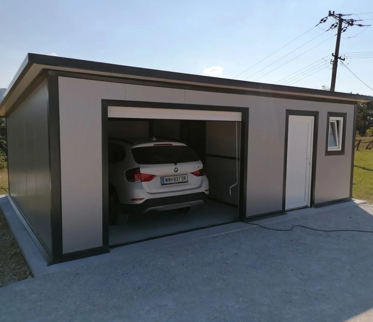 Izrada montažne garaže 8m x 6m sa montažom u Smederevu Montažna garaža obložena sendvič panelima 50mm debljine sa montažom u Smederevu. Sivi paneli, antracit lajsne i olučni sistemi. 2x eolo vrata sa daljinskim otvaranjem, 1x pomoćna pvc vrata bela i 2x pvc prozor 80×80. Krov na dve vode sa prepustima. Materijal : #montažnehale #montaznehale #montaznahala #montažniobjekti #čeličnekonstrukcije #metalnekonstrukcije #oluci #limarskiradovi...